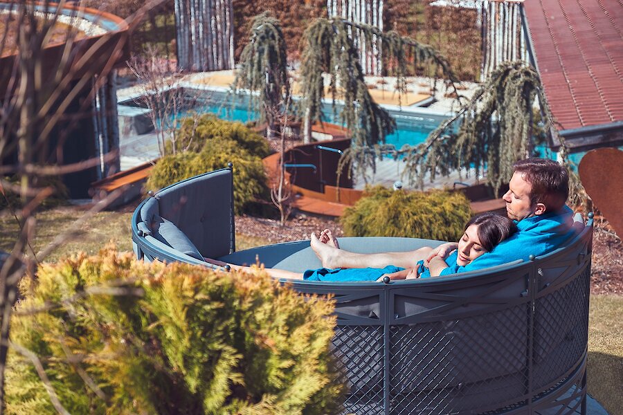 Der außen liegende Whirlpool hat ganzjährig eine angenehme Temperatur von 36°C - vor allem im Winter bei Kälte und Schnee eine einzigartige Entspannungsmöglichkeit!